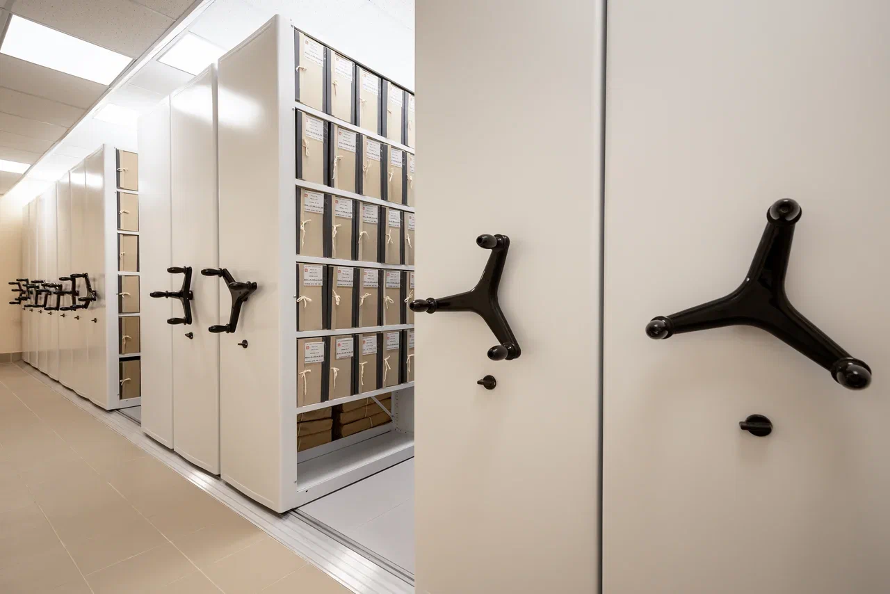 Передвижение от электропривода. Управление от кнопок, сенсорной панели или компьютера. Для большого архива - современное и технологичное решение.